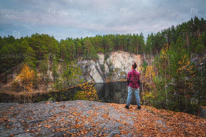 Девушка в красной рубашке смотрит на горное озеро и лес осенью