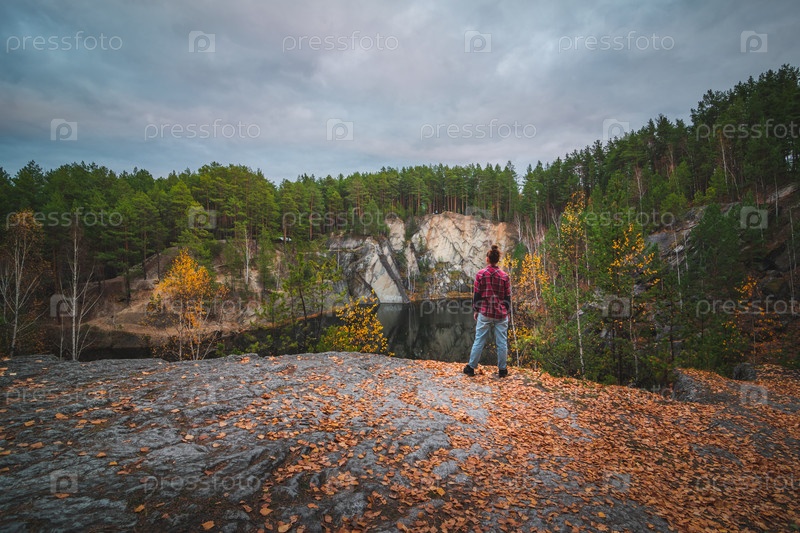 Девушка в красной рубашке смотрит на горное озеро и лес осенью