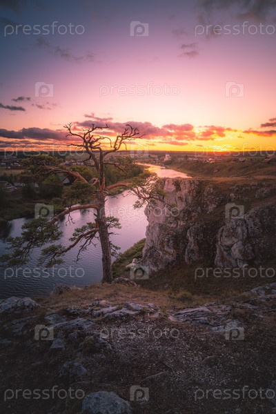 Закат над утесом и сосной на берегу реки