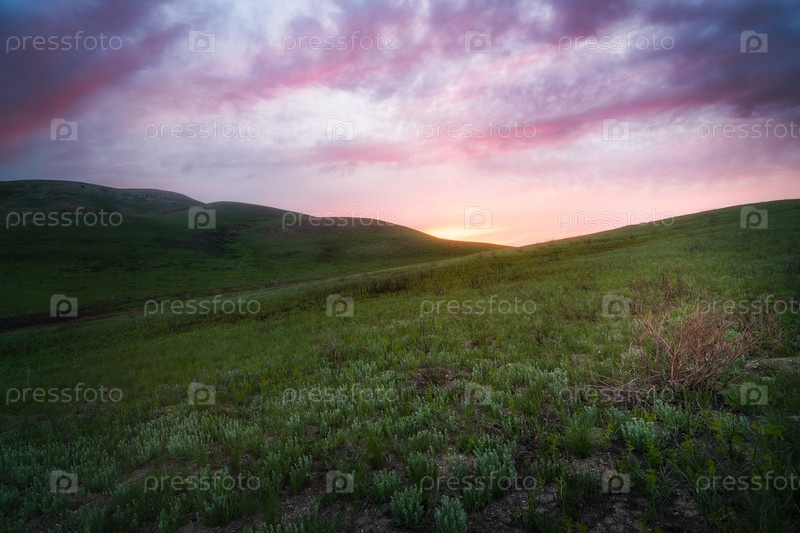 Красочный розовый рассвет над холмами в степи