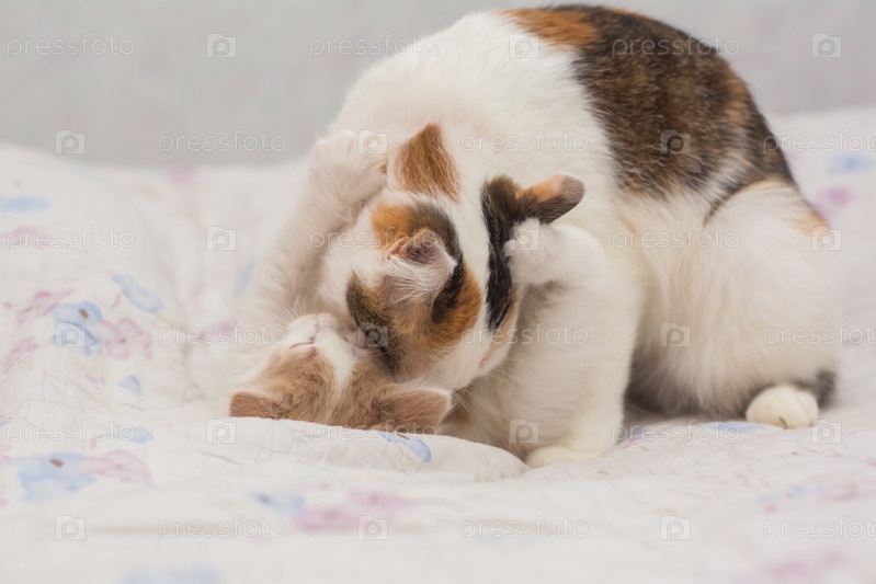 Кошка играет со своими котятами