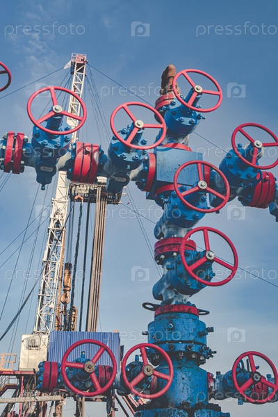 Арматура фонтана высокого давления в газовой скважине. На заднем плане размытое изображение буровой установки на северном газовом месторождении в Арктике