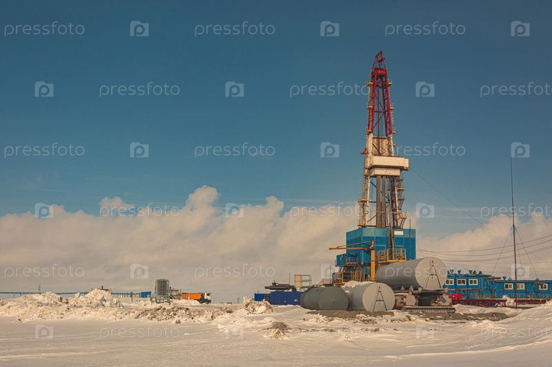 Общий вид буровой установки для бурения скважин на нефтегазовом месторождении в Арктическом регионе. Зима. День. Буровое оборудование и техническая инфраструктура