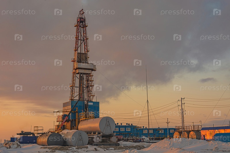 Общий вид буровой установки для бурения скважин на нефтегазовом месторождении в Арктическом регионе. Зима. День. Буровое оборудование и техническая инфраструктура