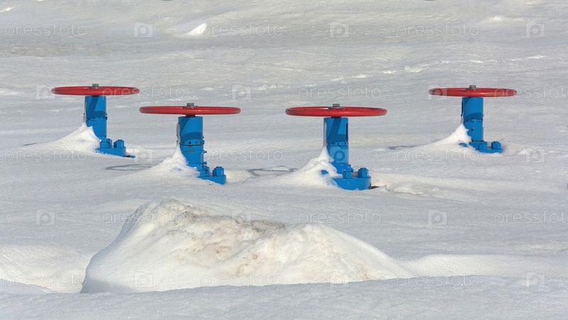 Клапаны газовой скважины торчат из снега. Замораживание добычи и поставок природного газа. Прекращение транспортировки газа потребителям