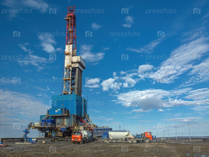 Общий вид буровой установки для бурения скважин на нефтегазовом месторождении в Арктическом регионе. Оборудование для цементирования обсадных колонн, спускаемых в скважину