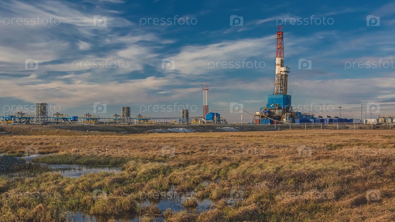 Весенний пейзаж арктической тундры на фоне инфраструктуры для бурения скважин и добычи нефти и газа. На переднем плане болотистая поверхность после таяния снега