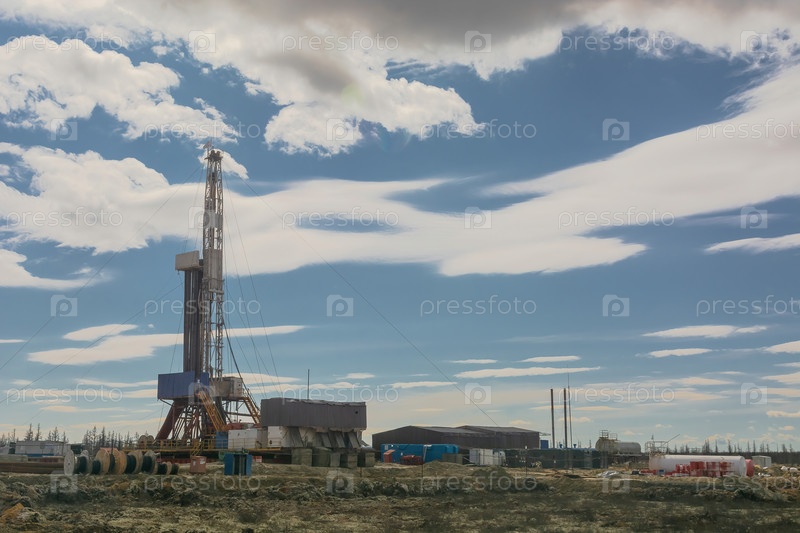 Участок в северной тундре на нефтегазовом месторождении. Буровая установка для бурения скважин. Инфраструктура и буровое оборудование для проведения буровых работ. Красивое выразительное небо