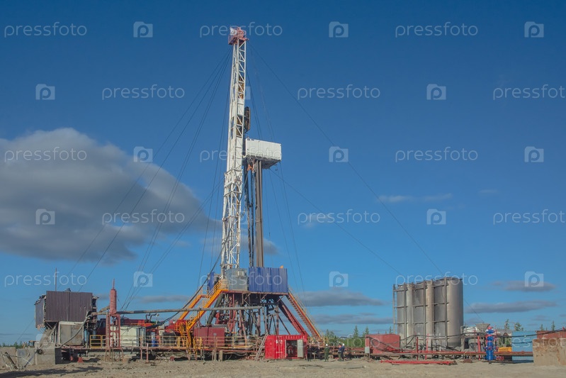 Буровая установка включена в ландшафт нефтегазового месторождения. Видна инфраструктура, средства связи и буровое оборудование. Буровая установка оснащена оборудованием для цементирования скважин