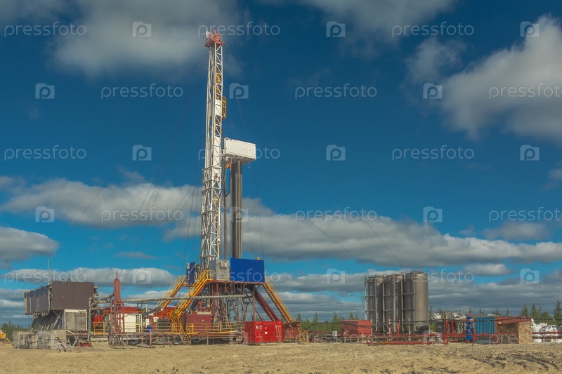 Буровая установка включена в ландшафт нефтегазового месторождения. Видна инфраструктура, средства связи и буровое оборудование. Буровая установка оснащена оборудованием для цементирования скважин