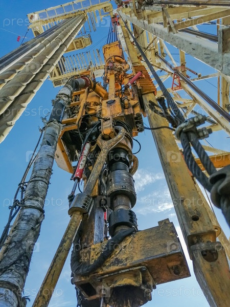 Вид на буровую установку изнутри вверх. Стальные бурильные трубы стоят. Верхний силовой привод перемещается по вышке на передвижной системе