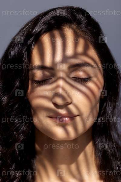 Портрет красоты молодой привлекательной женщины с закрытыми глазами и зеленым листом