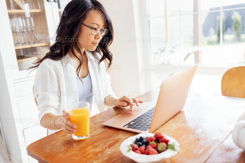 Милая девушка учится удаленно в столовой дома