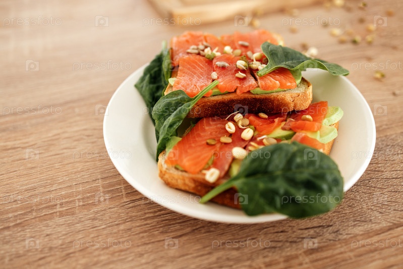 Свежий копченый лосось на тосте со шпинатом и семечками. Здоровые и вкусные бутерброды на деревянном столе