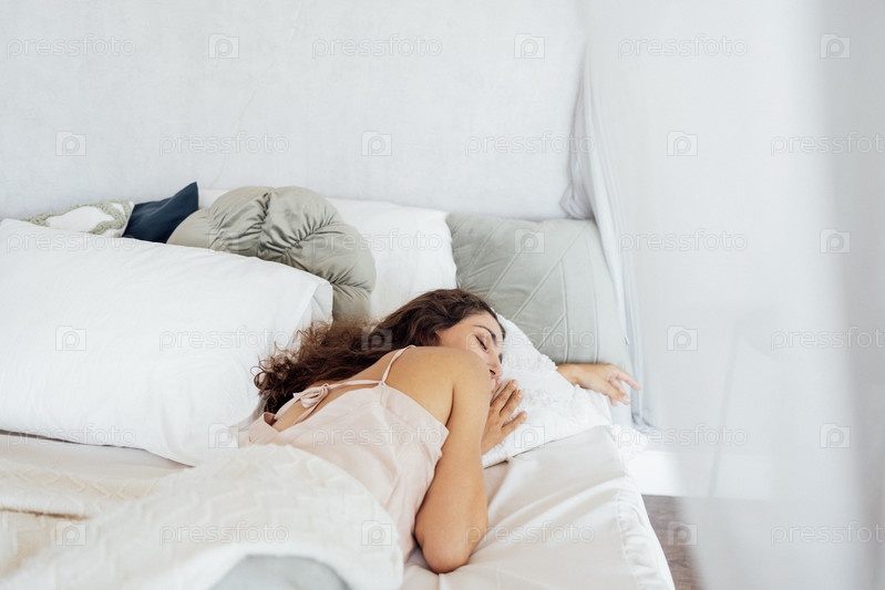 Привлекательная счастливая молодая женщина лежит в постели с закрытыми глазами