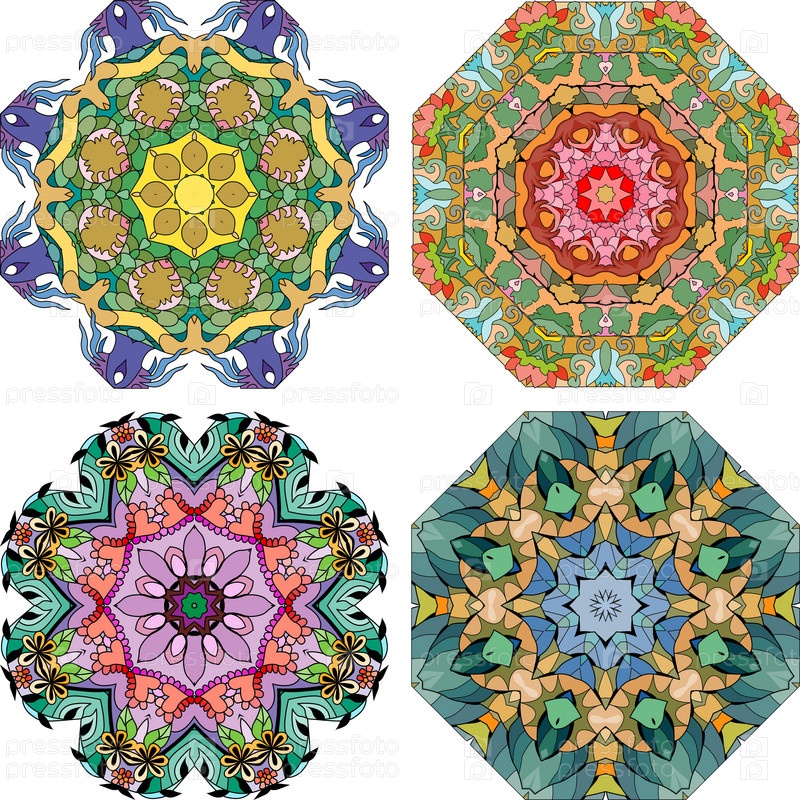 Нарисованный вручную набор из 4 цветных мандал для украшения