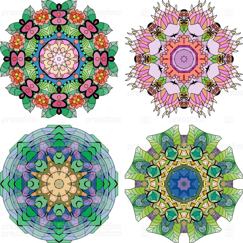 Нарисованный вручную набор из 4 цветных мандал для украшения