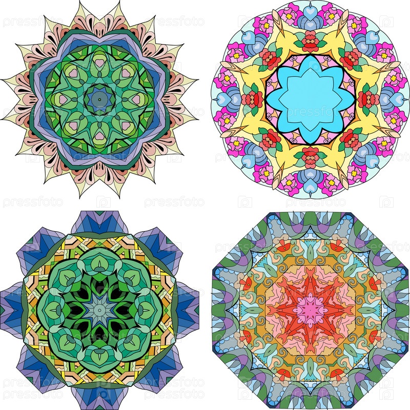 Ручная роспись художественного дизайна. Цветной набор рисованной иллюстрации из 4 мандал для украшения