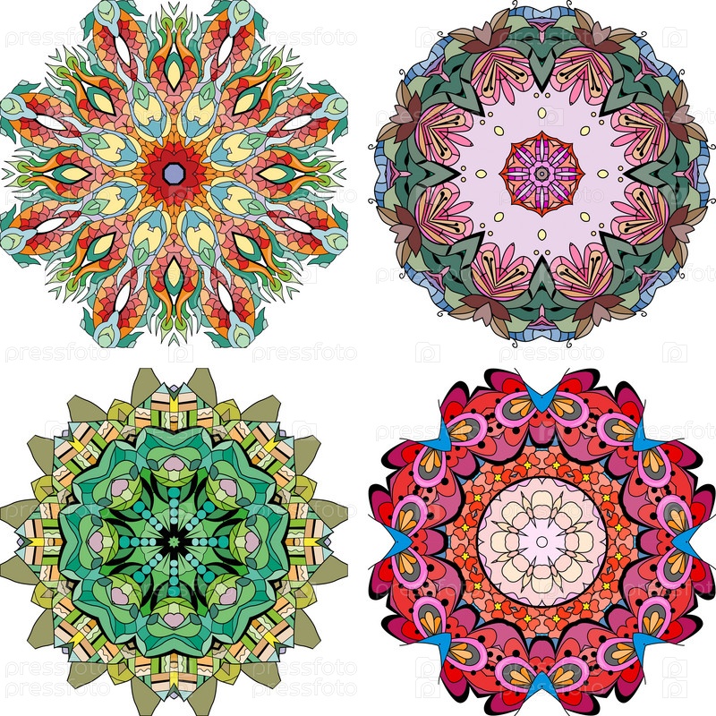 Нарисованный вручную набор из 4 цветных мандал для украшения