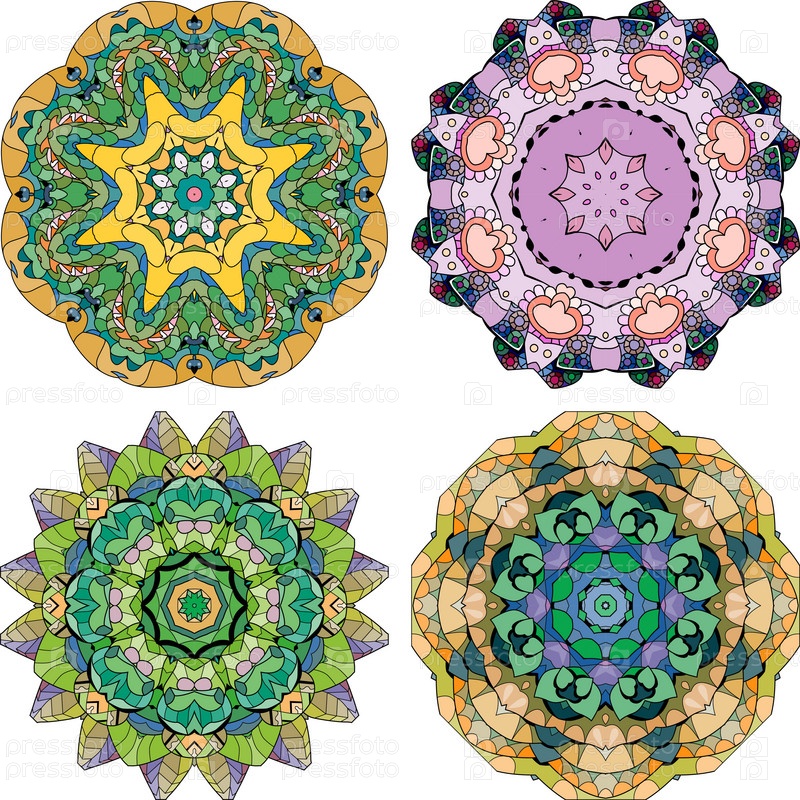 Нарисованный вручную набор из 4 цветных мандал для украшения