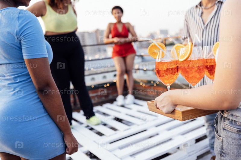 Многонациональным друзьям подают вкусные алкогольные коктейли с ломтиками апельсина. Крупный план стаканов с вкусным замороженным аперолем на деревянном подносе