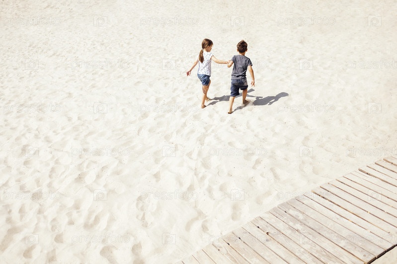 Двое маленьких детей гуляют по песчаному пляжу. Симпатичный мальчик и девочка держатся за руки и идут к морю