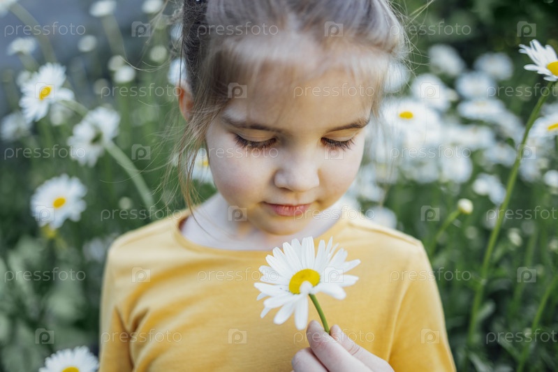 Крупным планом детский портрет милой маленькой девочки в желтой рубашке, держащей и смотрящей на ромашку в руке