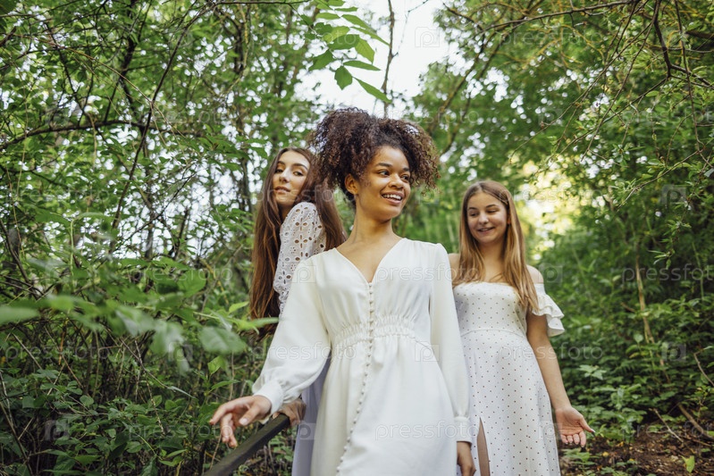 Три счастливые симпатичные улыбающиеся девочки-подростки в белых летних элегантных платьях идут по тропинке в лесу