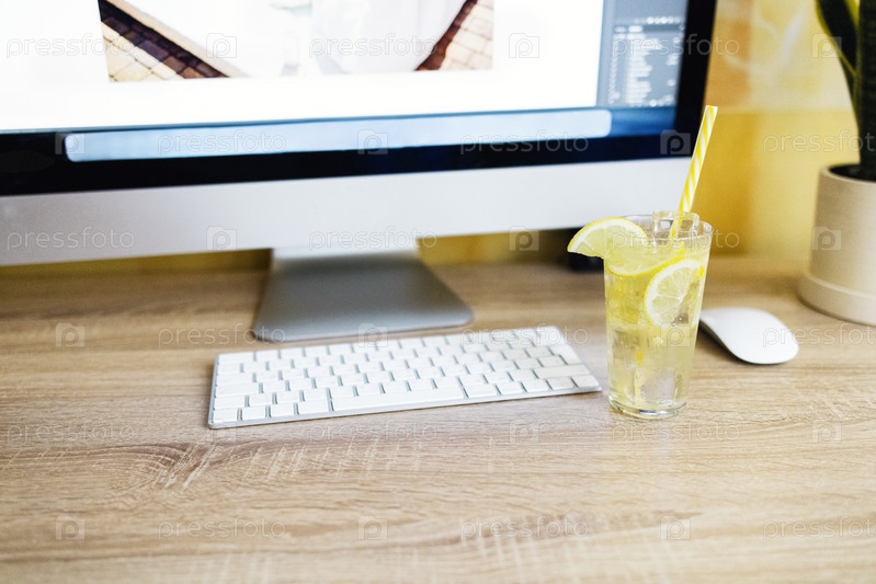 Вкусный холодный линомад на рабочем месте рядом с монитором и клавиатурой