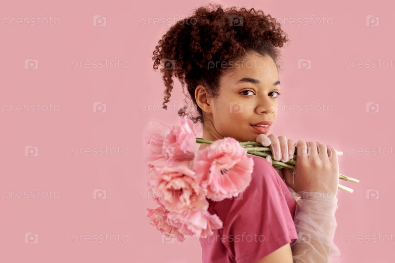 Красивая африканская девушка держит возле лица букет розовых цветов