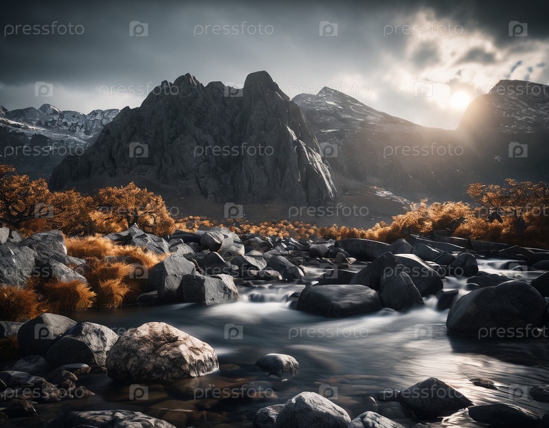 Красивый кинематографический горный пейзаж с черным мрамором и гранитом
