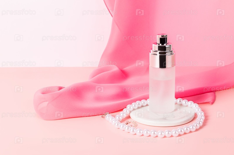 Матовый флакон-дозатор с натуральным косметическим продуктом, сывороткой для ухода за кожей лица на круглом подиуме из белого мрамора и жемчужными бусинами. натюрморт