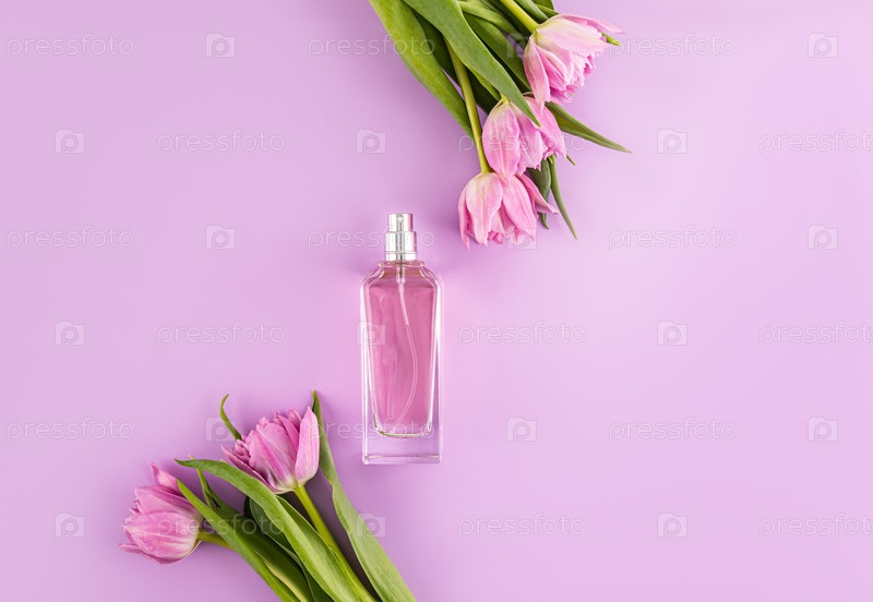 Красивый флакон женских духов с нежным ароматом на фиолетовом фоне среди цветов тюльпанов. Вид сверху. Плоская планировка. Место для копирования