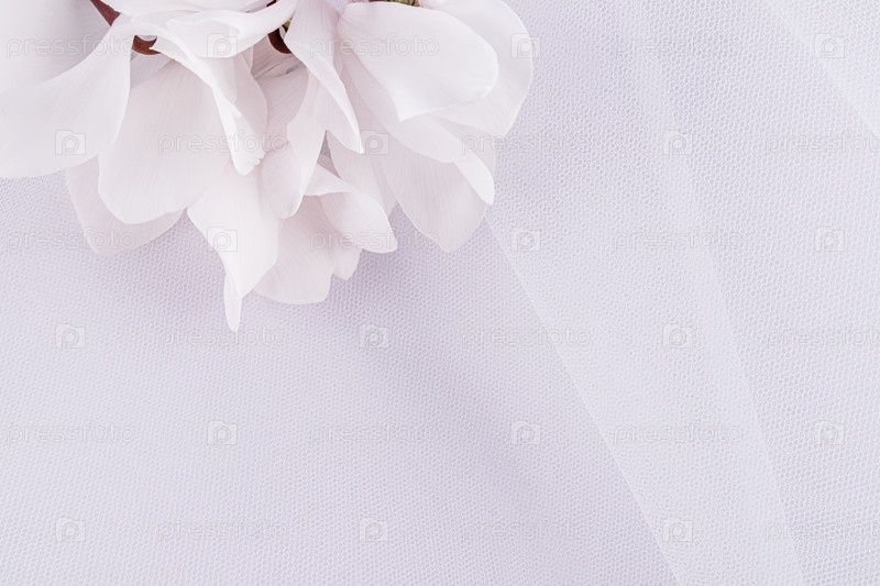 Нежный воздушный свадебный фон для дизайна, открытки, приглашения. белые складки фаты невесты и белые живые цветы. Романтический дизайн. Место для копирования