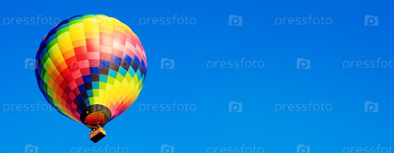 Разноцветные воздушные шары парят в утреннем голубом небе. Баннер
