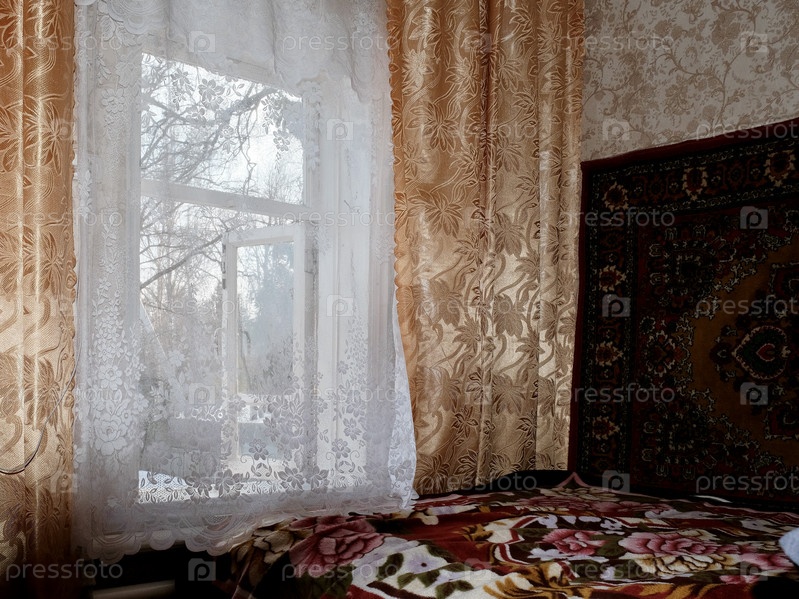 Спальня в бабушкином доме с желтыми шторами и винтажным интерьером со старой деревянной оконной рамой, открытой на весеннюю улицу