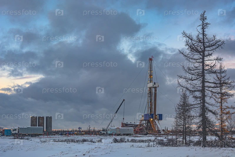 Гармоничное сочетание природы и техногенного ландшафта нефтегазового месторождения с буровой установкой и специальной техникой в полярной тундре