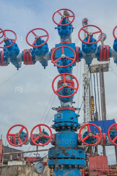 Арматура фонтана высокого давления в газовой скважине. На заднем плане размытое изображение буровой установки на северном газовом месторождении в Арктике