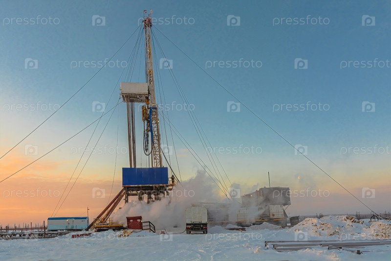 Бурение скважин зимой на нефтегазовом месторождении в Арктике. Полярный день с текстурированным красивым небом. Паровые затяжки для отопительного оборудования