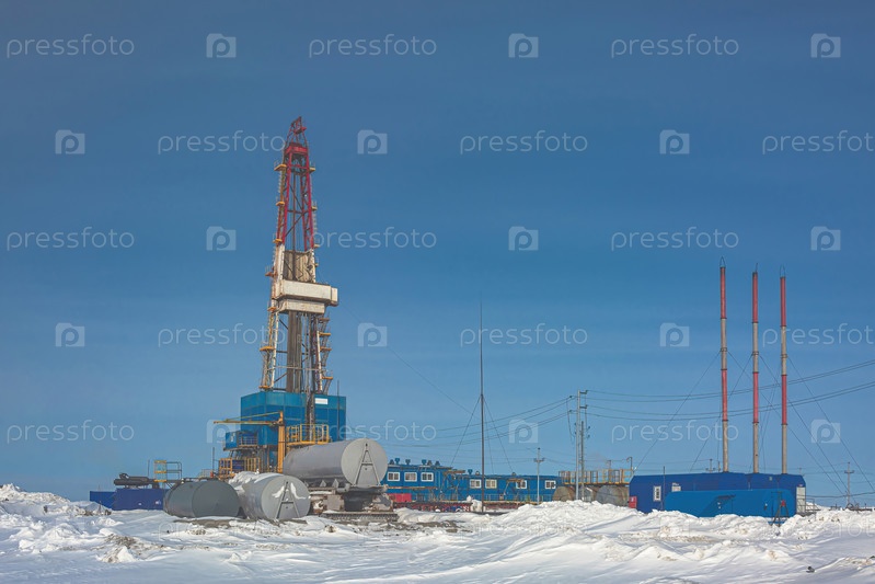 Общий вид буровой установки для бурения скважин на нефтегазовом месторождении в Арктическом регионе. Зима. День. Буровое оборудование и техническая инфраструктура