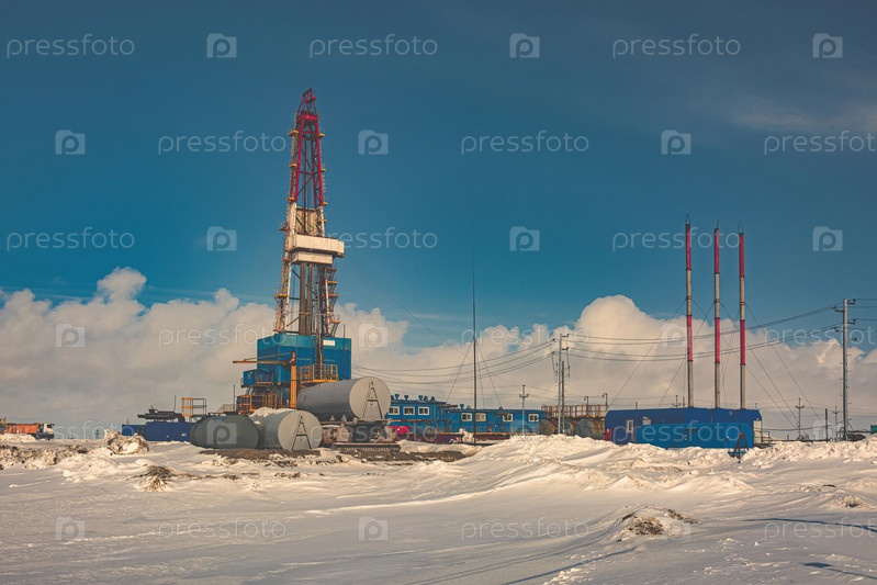 Общий вид буровой установки для бурения скважин на нефтегазовом месторождении в Арктическом регионе. Зима. День. Буровое оборудование и техническая инфраструктура