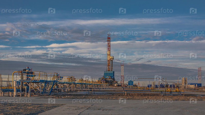 Скважины, добывающие природный газ на месторождении в Арктике. Фонтанное оборудование и технологическая обвязка группы скважин для добычи газа. На заднем плане буровая установка. Красивое небо