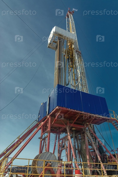 Буровая установка для бурения скважин на нефть и газ. Общий детальный вид. Вид сбоку снизу вверх. На фоне прекрасного неба. Буровая вышка на основании и бурильные трубы для спуска в скважину