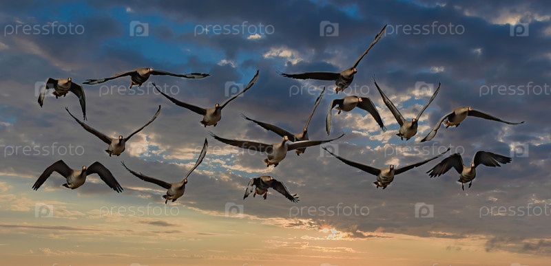 Дикие гуси летают на фоне текстурированного облачного неба. Птицы летят прямо на фотографа