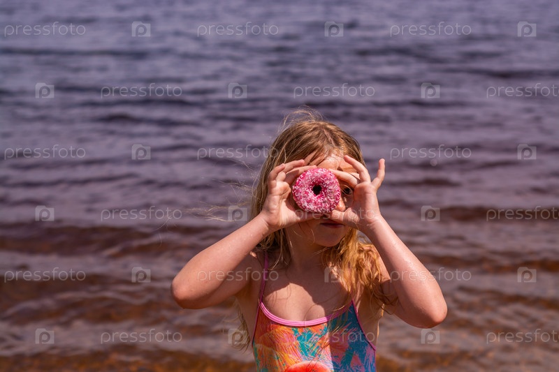 В жаркий летний день ребенок отдыхает на озере. Девочка на пляже. Девушка держит в руках розовый пончик. В знойный летний день ребенок расслабляется у озера. Девушка на пляже. Девушка держит в руках розовую поничку