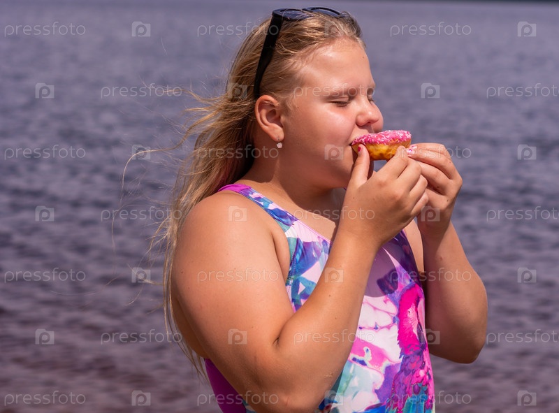 В жаркий летний день ребенок отдыхает на озере. Девочка на пляже. Девушка держит в руках розовый пончик. В знойный летний день ребенок расслабляется у озера. Девушка на пляже. Девушка держит в руках розовую поничку