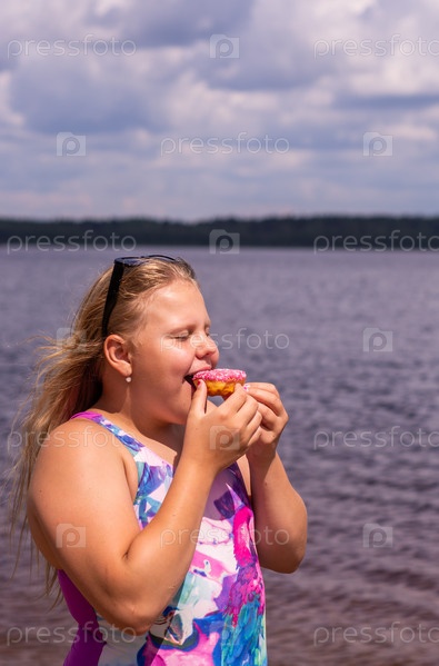 В жаркий летний день ребенок отдыхает на озере. Девочка на пляже. Девушка держит в руках розовый пончик. В знойный летний день ребенок расслабляется у озера. Девушка на пляже. Девушка держит в руках розовую поничку