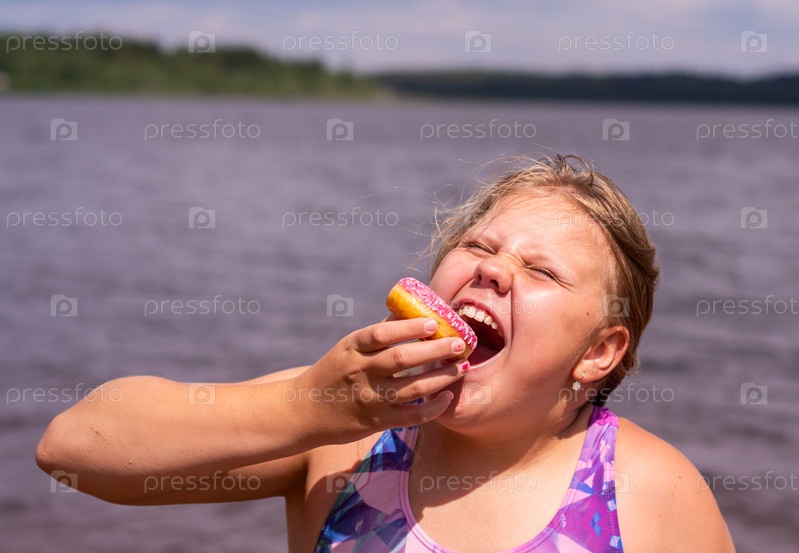 В жаркий летний день ребенок отдыхает на озере. Девочка на пляже. Девушка держит в руках розовый пончик. В знойный летний день ребенок расслабляется у озера. Девушка на пляже. Девушка держит в руках розовую поничку