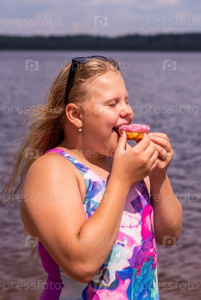 В жаркий летний день ребенок отдыхает на озере. Девочка на пляже. Девушка держит в руках розовый пончик. В знойный летний день ребенок расслабляется у озера. Девушка на пляже. Девушка держит в руках розовую поничку