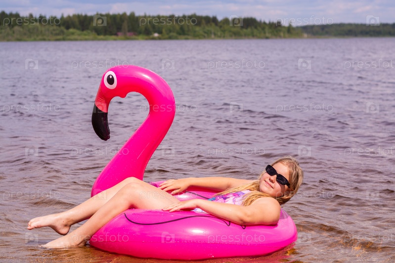 В жаркий летний день ребенок отдыхает на озере. Девочка на пляже. Девушка плавает на надувном розовом фламинго. В знойный летний день ребенок расслабляется на озере. Девушка на пляже. Девушка плывет на надуваемом розовом фламинго